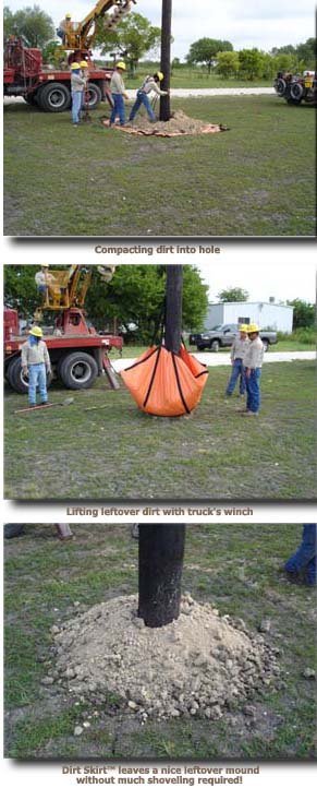 The 10'x10' size and "hook and loop" fastener allows the Dirt Skirtto quickly lay out flat over the work site. The skirt is very simple to use and there are no special tools required. The time required to set a utility pole is reduced when using the Dirt Skirt�, which becomes very apparent at large work sites and areas of dense foliage. Since it is made from a durable